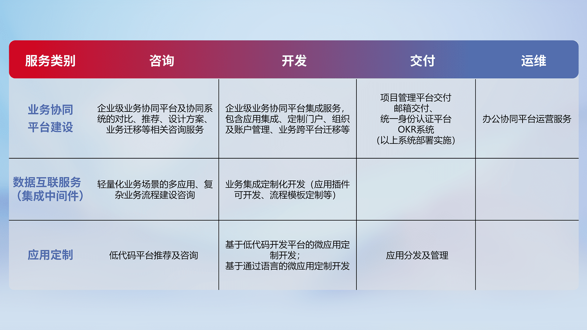 针对钉钉、、企微、、IDaas等平台级产品提供产品的规划、、方案、、、、交付、、定制化开发等服务,,,,实现如统一协同办公、、智能客户服务、、、、混合会议管理、、、智能数据查询、、、、等业务场景,,实现数字化转型。。